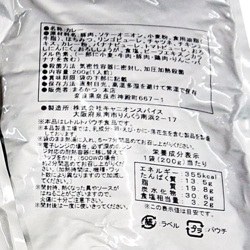 ■原材料名:豚肉、ソテーオニオン、小麦粉、食用油脂(牛脂)、はちみつ、リンゴピューレ、チャツネ、チキンエキス、カレー粉、バナナピューレ、トマトピューレ、おろしにんにく、おろししょうが、食塩、ビーフエキス/カラメル色素、(一部に小麦・牛肉・豚肉・鶏肉・りんご・バナナを含む)